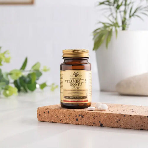 Solgar Vitamin D3 1000 IU 100 Çiğnenebilir Tablet, vücudun günlük D vitamini ihtiyacını karşılamak için formüle edilmiş bir takviye üründür. Her bir çiğnenebilir tablet, güneş ışığından yeterince fayda sağlayamayan veya D vitamini eksikliği riski taşıyan bireyler için ideal bir seçenektir.