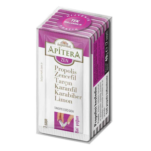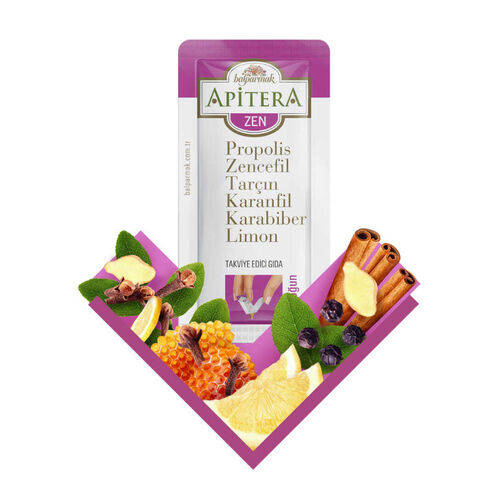 Balparmak Apitera Zen, içeriğinde çinko, selenyum, C vitamini ve diğer önemli besinleri barındıran bir takviye edici gıda ürünüdür. Her bir paketinde 7 adet bulunur ve her biri 7 gram ağırlığındadır. Ürün, Balparmak markası güvencesiyle sunulmaktadır.
