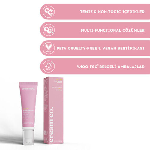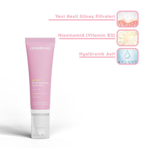 Cream Co'nun güneş koruma serisi, cildinizi güneşin zararlı etkilerinden korurken aynı zamanda nemlendirir ve yaşlanma karşıtı özellikler sunar. SPF 50 gücü ile yoğun güneş ışınlarına karşı etkili koruma sağlar. Hafif formülü cildinizde ağırlık hissi bırakmadan kolayca emilir. Günlük kullanıma uygun olan bu güneş kremi, cildinizin genç ve sağlıklı görünmesine yardımcı olurken UV ışınlarının neden olduğu erken yaşlanma belirtilerine karşı savaşır. Güvenle kullanabileceğiniz formül, cildinizin doğal dengesini korurken uzun süreli koruma sunar. Cream Co SPF 50 Broad Spectrum Sunscreen, cildinizin günlük güneş koruma ihtiyaçlarını karşılamak için ideal bir seçimdir.