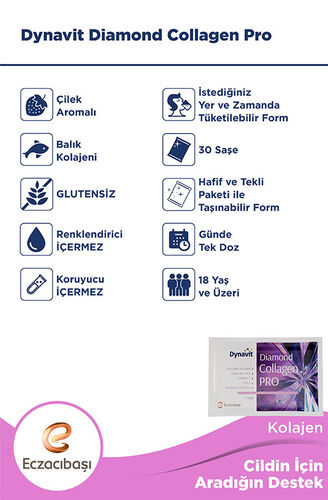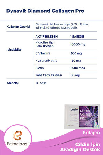 Ürününüz, Eczacıbaşı markasının kalitesiyle sunulan Dynavit Diamond Collagen PRO 30 Saşe, sağlıklı cilt ve eklem destekleyici bir takviye içecektir. Her bir saşe, vücudunuzun ihtiyacı olan kolajen desteğini sağlamak için formüle edilmiştir.