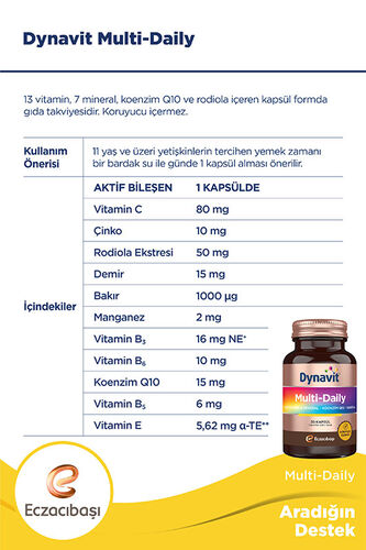 Bu takviye ürün, genel sağlığınızı desteklemeye yardımcı olabilir ve günlük enerji ihtiyacınızı karşılamaya destek sağlayabilir. Eczacıbaşı kalitesi ve güvencesiyle üretilen Dynavit Multi Daily 30 Kapsül, güvenilir bir tercih olabilir.