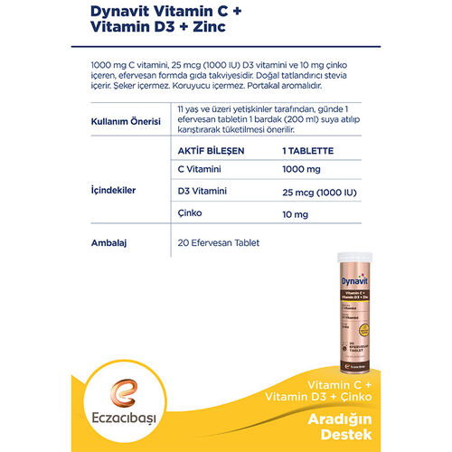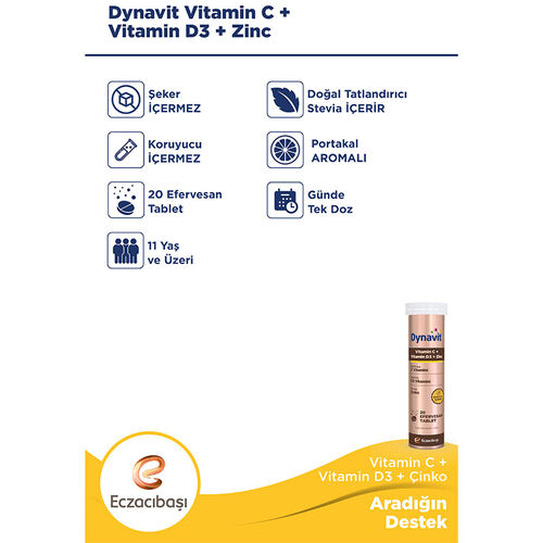 Eczacıbaşı Dynavit Vitamin C + Vitamin D3 + Çinko Efervesan Tablet 20 Adet