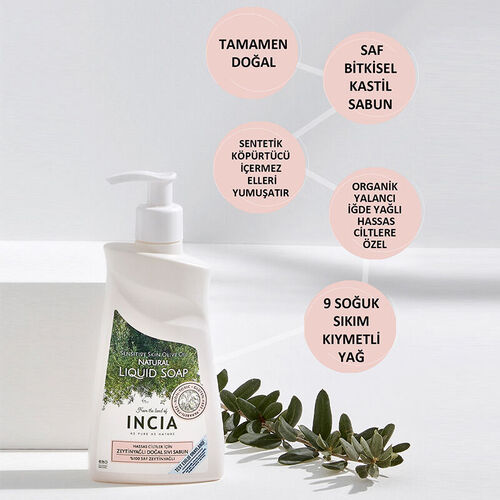INCIA Hassas Ciltler İçin Zeytinyağlı Doğal Sıvı Sabun, %100 doğal ve organik bileşenler içermektedir. Kimyasal katkı maddeleri içermez ve cildi tahriş etmez. Günlük kullanıma uygundur.