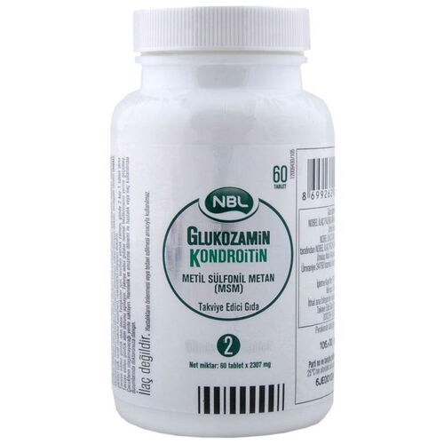 NBL Glukozamin Kondroitin MSM 60 Tablet, eklem sağlığını desteklemek amacıyla formüle edilmiş bir takviye edici gıdadır. Her bir tablet, glukozamin, kondroitin ve MSM içerir. Glukozamin, eklem kıkırdağının yapı taşlarından biri olarak bilinir ve eklem fonksiyonlarının korunmasına katkıda bulunabilir. Kondroitin sülfat, eklem kıkırdağının elastikiyetini ve dayanıklılığını artırmaya yardımcı olabilir. MSM (Metil Sülfonil Metan), eklem sağlığını desteklemek için yaygın olarak kullanılan bir bileşendir.