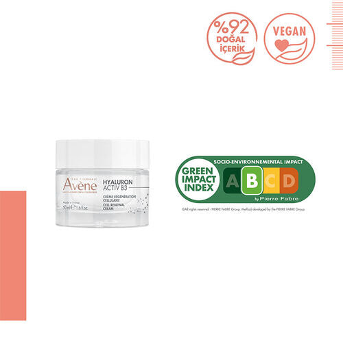 Avene Hyaluron Activ B3 Krem 50 ml, dermatolojik olarak test edilmiş ve cildi tahriş etmeden yumuşak bir şekilde bakım yapar. Günlük kullanıma uygun olan bu krem, cildinizi canlandırır ve sağlıklı bir görünüm kazandırır.