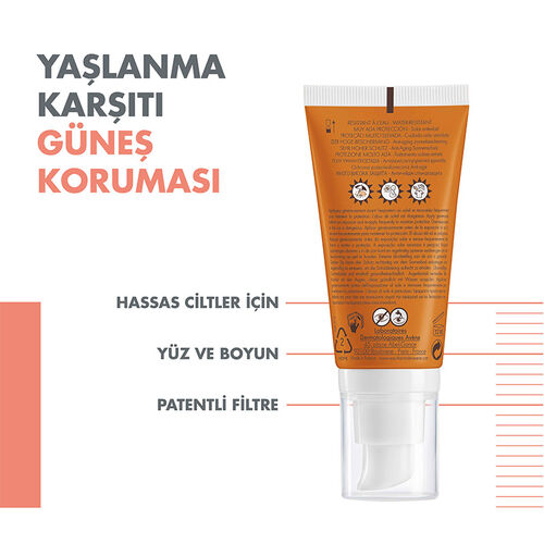 Avene Solaire SPF 50, cilt için yüksek koruma sağlayan, yaşlanma karşıtı özelliklere sahip bir güneş kremidir. Güneşin zararlı etkilerine karşı cildi güçlendirir, lekelerin oluşumunu engeller ve cilde nem kazandırır. Güneşin zararlı UVA ve UVB ışınlarına karşı etkili koruma sunar. Avene termal suyu ile formüle edilmiştir, cildi sakinleştirir ve yeniler. Hipoalerjenik yapıya sahiptir, ciltte alerji riskini en aza indirir.