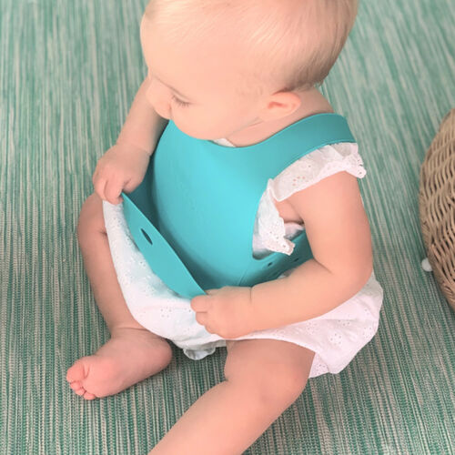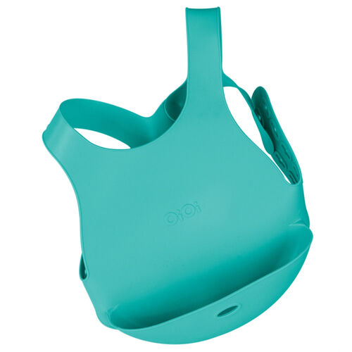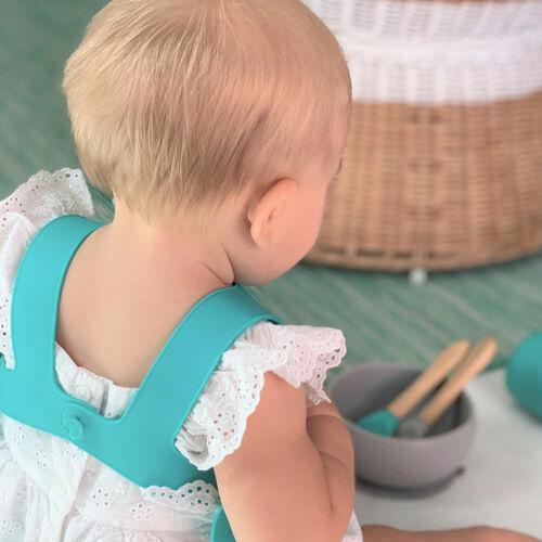 - Su yeşili renkte sunulan bu mama önlüğü, modern ve şık tasarımıyla beğeni toplar.