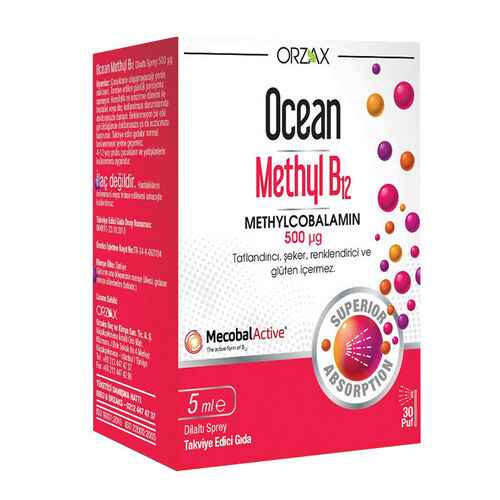Orzax Ocean 500 µg Methyl B12 Sprey, vitamin B12 eksikliğini önlemeye yardımcı olan bir besin takviyesidir. Her sprey, vücut için gerekli olan 500 µg metil B12 vitamini içerir. Sprey formülü, hızlı emilim sağlayarak etkinliği artırır. Orzax'un yüksek kalite standartlarına uygun olarak üretilmiştir. Ürün, kullanım kolaylığı ve taşınabilirlik sağlayan pratik bir sprey şişe şeklinde sunulur. Orzax Ocean Methyl B12 Sprey, günlük B12 vitamin ihtiyacını karşılamak için ideal bir seçenektir.